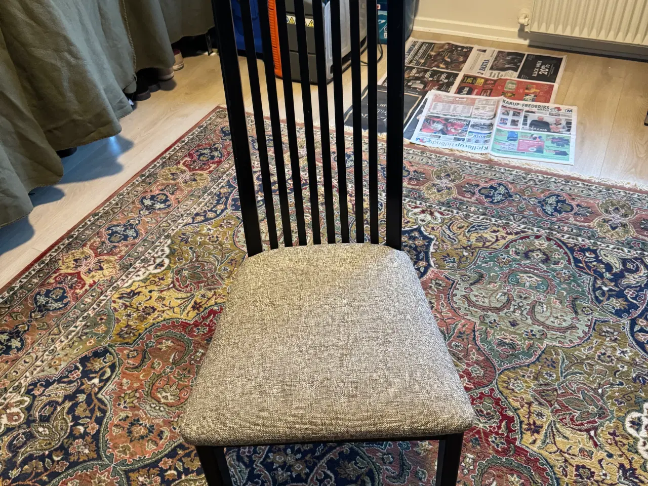Stole fremtræder velholdt, sorte med grå betræk. Bud modtages. Spisebord kan evt medfølge .
