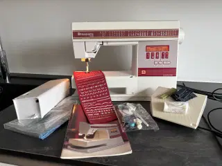 her er en dejlig enkel og meget lidt brugt symaskine til salg den fremtræder som ny og syr gerne i diverse stoffer bla. jeans - vatt stof - skind - m,m, ( 85 watts motor ) har diverse funktioner med bla. knaphuls og 2 nåle system har fri arm + løst. bord/skuffe til tilbehør + manual med følger pris 575 kr