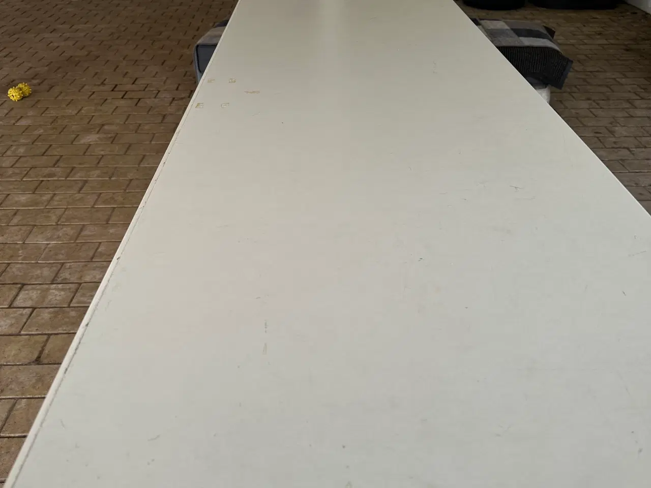 Kan køres med. Er 3 m lang og 60 cm bred, bunden/hylden er 2 m lang og 50 cm bred. Stel er af metal Bordhøjden er 90 cm, kan bruges til alt