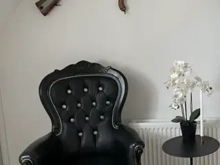 Sort læderlænestol med skammel. Elegant klassisk design med god sidekomfort, trinløs regulerbar ryg. Pæn og velholdt. Stel i eg.