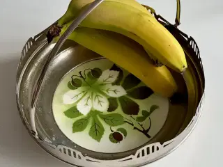 Skål og fad af pastelgrønt glas, med hjemmemalet, patineret blomstermotiv Skål: Ø24,5 x 9 cm Fad: Ø24,5 x 3 cm - fladt skår (sidste billede)