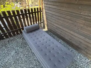 En god daybed med korpus af oregon pine, sæde og ryg betrukket med hhv. blåligt og beige møbelstof. Sengetøjsmagasin bag ryg. 1970'erne. H. 84,5 cm, SH. 41 cm, B. 193 cm, D. 85 cm. (165) Kr.1.300,- (Kan leveres