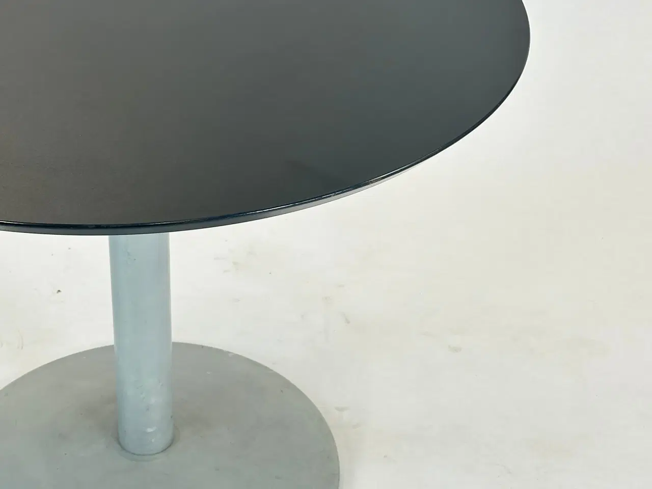 Rundt mødebord – Stilrent og FunktioneltDette runde bord er et tidløst og alsidigt møbel, der passer perfekt til både mødelokaler, kantiner og sociale områder. Med sin minimalistiske æstetik og robuste konstruktion tilbyder det en elegant løsning til enhver arbejdsplads eller opholdsrum.Design og MaterialerBordplade: Slidstærk, mat sort overflade, der er nem at rengøre og vedligeholde.Stel: Solid sølvgrå søjlebase med en rund fod, der sikrer stabilitet og et moderne udtryk.Rund form: Ideel til samarbejde og interaktion, da det skaber en åben og inkluderende atmosfære.EgenskaberKompakt størrelse: Perfekt til både mindre møder og uformelle samtaler.Robust konstruktion: Egnet til daglig brug i professionelle omgivelser.Fleksibelt design: Passer til både moderne og klassiske interiører.AnvendelsesmulighederMødelokaler: Skaber et professionelt og indbydende miljø til samtaler og brainstorming.Kantiner og fællesområder: Ideelt til spise- eller kaffepauser i arbejdspladsens sociale zoner.Receptioner og loungeområder: Et stilfuldt supplement til gæsteområder, der sikrer en behagelig oplevelse.Med sin enkle elegance, praktiske funktioner og solide kvalitet er dette runde bord et oplagt valg til virksomheder, der ønsker at kombinere stil og funktionalitet.Dette er et brugt møbel fra en dansk virksomhed, hvilket betyder, at der kan være små brugsspor. Alle møbler er dog omhyggeligt renset og gennemgået for at sikre, at de lever op til høje standarder for både kvalitet og æstetik.