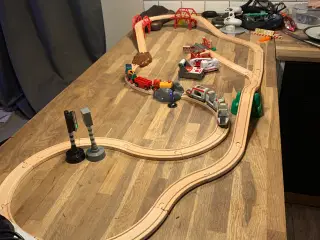 Briotog med diverse tog, skinner, færge, kran og huse som på billederne.
