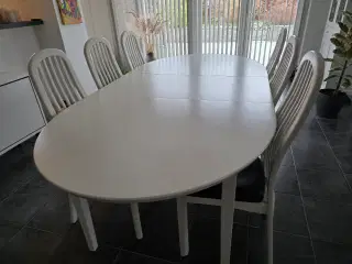 Skønt stort egetræs spisebord med 10 stole. Der kan nemt sidde 12 om bordet. Er i sommerhus, så kun lidt brugt.