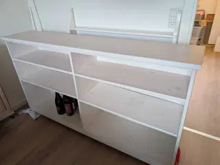 Robust hvid reol med 2 hylder / 6 rum Brugt, men i rigtig fin stand. Mangler 1 klistermærke samt 1 klistermærke der er ved at gå af. Mål: Højde 117,5 cm Bredde 61,5 cm Dybde 33 cm Hyldehøjde 35,8-36,2 cm. Hylderne kan ikke flyttes. Reolen har 2 hylder, og der medfølger 3 skillerumshylder, som kan sættes lodret, så reolen får 6 rum. Der skal blot fjernes nogle af klistermærkerne. Står på 4 runde grå fødder. Mener at den muligvis er fra Møbelland i Ringsted. Kan afhentes i Holbæk efter aftale.