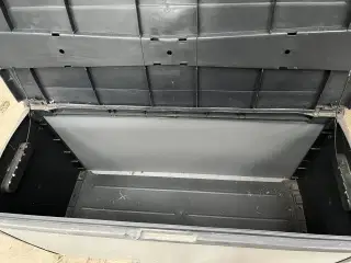 En godt brugt hyndeboks af ukendt fabrikat. Låsebeslaget er knækket af men virker i øvrigt som den skal. Den er tæt når låget er lukket. Vi har brugt en flise til at holde låget nede med. Sælges da vi skal flytte i lejlighed. Størrelse: Ca. L139 x H60 x D68 cm