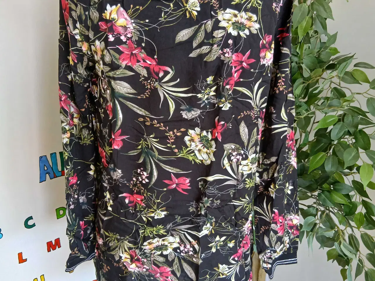 547. Langærmet tunika med et blomstret mønster i forskellige farver på en sort baggrund. Tunikaen har en ribbet kant ved halsudskæringen og ærmerne. Er i 100% Viskose, Bryst 92cm Længde 80cm Ærmelænde 38cm Sender med dao GLS eller bring Se også al det andet tøj jeg har til salg