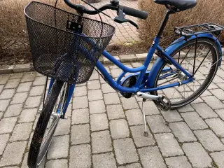 , fodbremse og håndbremse, kurv på styr, lås, støttefod, lys, mørk grøn, sidespejl, støttefod, kun lidt brugt.