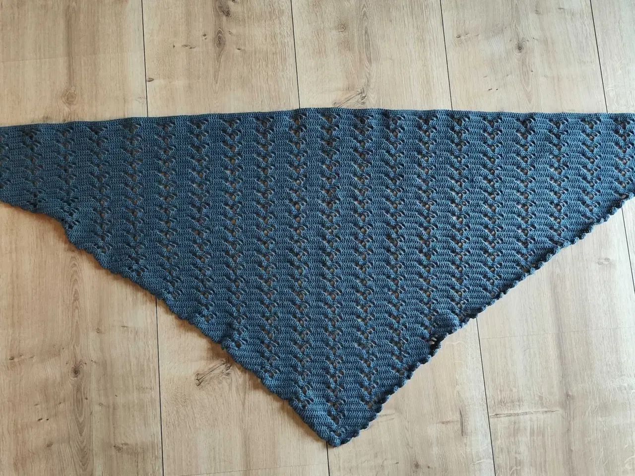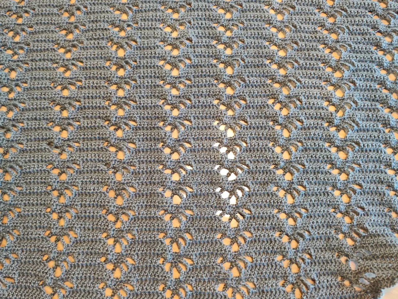 Hæklet sjal med hulmønster, grå uldgarn. Ca mål 70x190. Fra ikke ryger hjem.