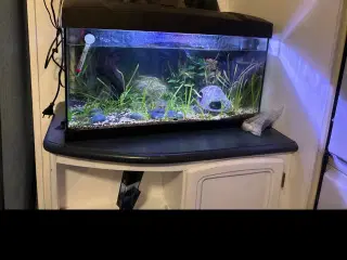 300 liter hvidt juwel ferskvands akvarie med indbygget sump, filter og pumpe og LED blåt og hvidt lys. Termostat og termometer medfølger. 3D baggrund indbygget og skjuler pumpe- og filtersegment udvendigt også. Der er lille prik på glas front ellers er det som nyt. Meget flot og enkelt. 120x50x52 cm målt på glasset. Lille indvendig ridse i glas uden linjer. Ligner ikke et stenslag og har været der fra starten. Se billede.