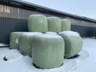 Midiwrap i 85×85 rundballer, 3. slæt fra 2025, lavet på blanding 35 der består af alm. rajgræs og hvidkløver, der forekommer også lidt rødkløver. Der er 16 stk. kan leveres mod betaling. Indeholder Ca. 150 kg pr. balle.