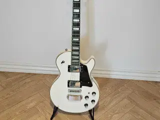 Her sælges en rigtig arbejdshest af en Epiphone Les Paul Standard Sort (Ebony). Guitaren er fra 2008 og bygget på Qingdao-fabrikken i Kina. Jeg har haft den siden 2010 og har primært været brugt i øveren og enkelte jobs. Den har lidt små ridser hist og her men ingen dybe. Den har et ding øverst på headstock men har absolut ingen betydning for spilbarhed. Den er fejlfri i elektroniken og spiller og lyder godt.