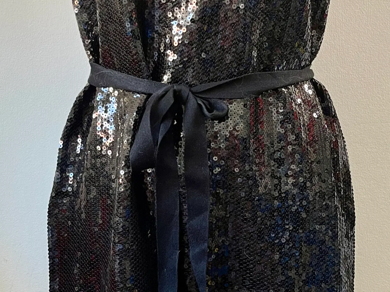 Supersmuk kjole med masser af palietter. Kjolen er i to lag, og kan bruges med eller uden bånd i taljen Materiale: 55% silke, 45% viscose. For: 100% polyester Mål: Brystvidde: 104 cm Længde: 93 cm Længde fra ærmegab og ned: 71 cm Talje: 100 cm Hoftevidde: 108 cm Omkreds ærmegab: 59 cm Bud fra kr 1200 plus porto / nypris kr 2599 Afhentning: København, Østerbro