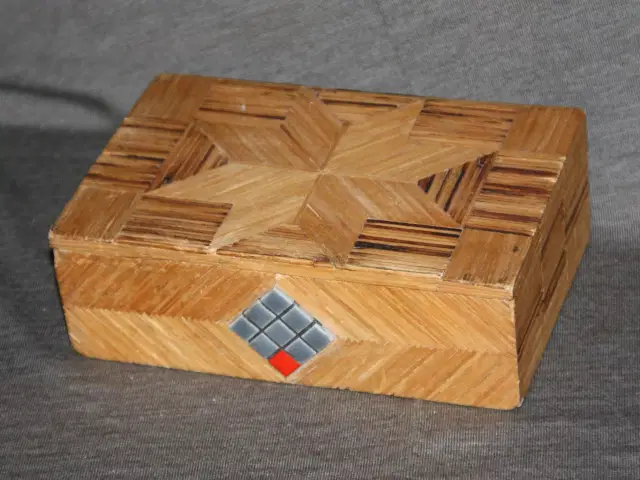 Håndlavet skrin lavet af tændstikker 21,5 cm x 13,5 cm x 7 cm Hvis det er muligt for jer må i gerne komme og se tingen / tingende efter forudgående aftale da min mand har mulighed for at være hjemme om dagen