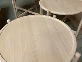 Bord Flot og praktisk massivt bord med hjul på to ben, højde 85 cm, bredde 58 cm, dybde 50 cm, fast massiv bordplade og to underliggende hylder. Flot og rustik.