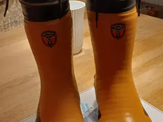 Sikkerhedssko i sort med orange detaljer og snørebånd. Skoene har en robust sål og forstærket tå.