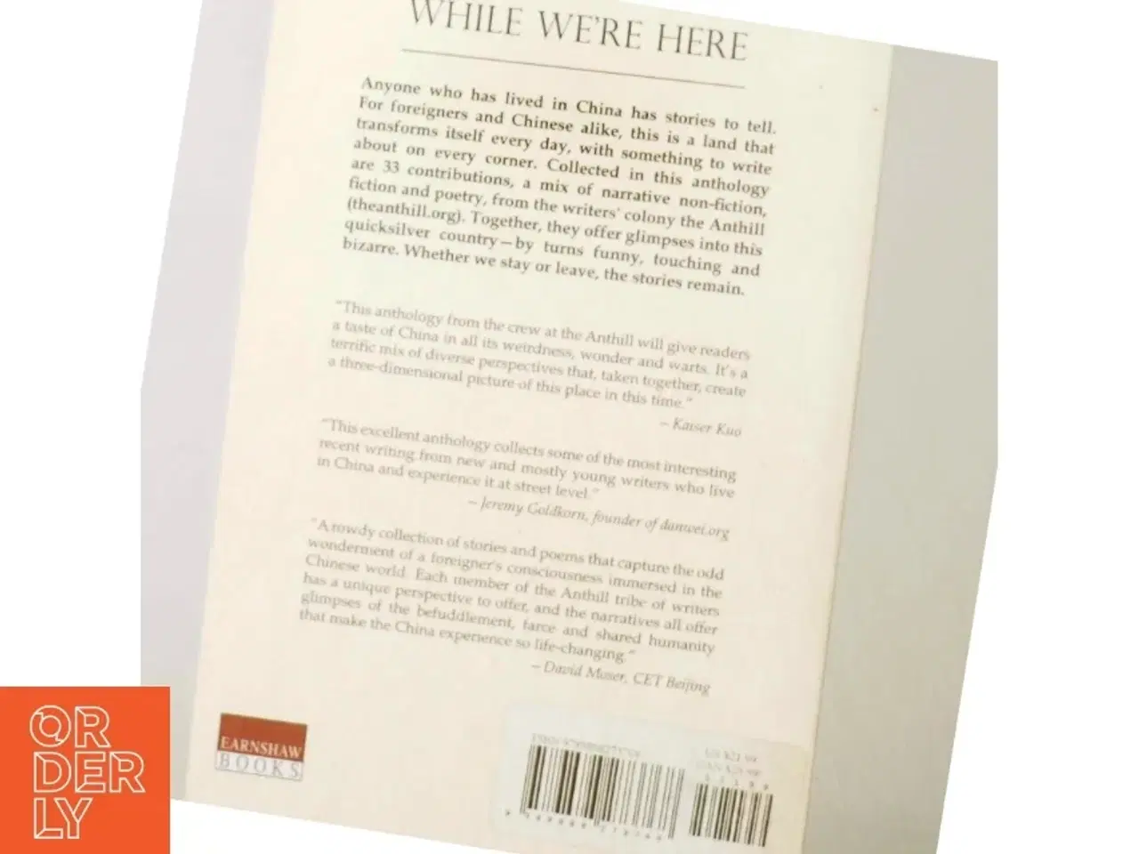 Klik på 'Se annoncen hos forhandleren' for at se varen i vores webshop China Stories from a Writers' Colony Anyone who has lived in China has stories to tell. For foreigners and Chinese alike, this is a land that transforms itself every day, with something to write about on every corner. Collected in this anthology are 33 contributions, a mix of narrative non-fiction, fiction and poetry, from the writers' colony the Anthill (theanthill.org). Together, they offer glimpses into this quicksilver country-by turns funny, touching and bizarre. Whether we stay or leave, the stories remain. Titel: While We're Here Forfatter: Alec Ash, Tom Pellman Forlag: China Today Udgivelsesår: 2015 Sprog: Engelsk Brand: Ukendt Farve: Ukendt Stand: 60 - Vi sender til hele landet for 49 kr. Leveringstiden er 1-3 hverdage. Du kan også gratis hente den på vores lager på Industrivej 10 i Slangerup. Er du i tvivl om varen stadig er til salg? Klik på knappen "Se annoncen hos forhandleren" for at se den i vores webshop. Kan du se den der, er den stadig til salg Orderly er en ny måde at købe brugt på. Vi har alle vores sælgeres ting på vores centrale lager. Derfor kan du være helt sikker på at få dine ting - og du kan samle flere ting på tværs af sælgere og kun betale én gang fragt.
