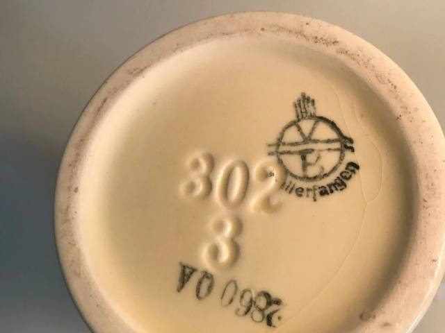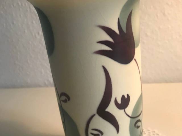 VILLEROY BOCH WALLERFANGEN Vase med lilla blomstermotiver fra 30?erne. Den er stemplet i bunden med V & B og wallerfangen og nr 302, 2860 QA. Der er et lille afslag i kanten. H 18 B 10.