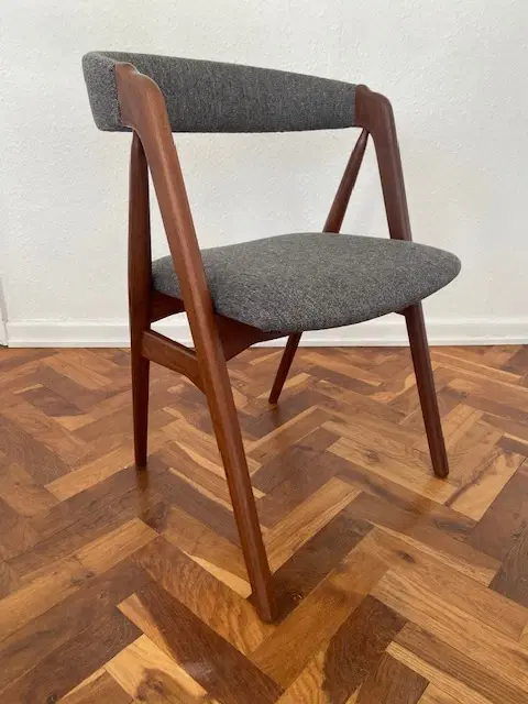 Ny polstret Theodor Frederik Harlev savbukke stol. Stolen er designet i 1958 og produceret fra Farstrup stolefabrik. Stolen er model 205 og udført i teaktræ. Stolen er blevet pudset og fået bivoks. Derudover er der kommet ny polstring i en flot gråmeleret farve, stoffet hedder Camira, Main Line Flax.
