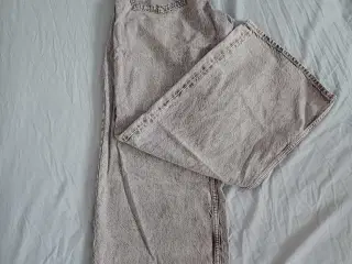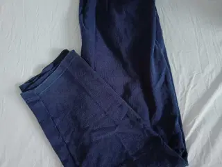 Blå bukser med hvid stribe i siden fra Zara, str. large, elastik i ryggen i linningen, snydelommer, kvaliteten er bomuld, polyester og elastan. Pæne og velholdte.