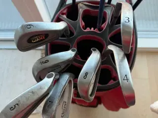 Flot golfsæt, vognen er en perfekt skubbevogn, med paraplyholder, med rum til scorekort og 2 bolde, samt teeholder, golfsætter er med putter P og S jern, jernene er fra 4 til 8 alle med fine intakt gribs, driver og fairway kølle nr 5, der er en ældre hybridkølle 24 grader virker perfekt, golfbanggen er af ældre dato, men alle lynlåse intakte.