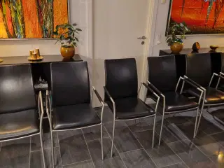5 stk. stole i formstøbt plast med armlæn og stålben, kan stables for nem opbevaring. 2 stk hvide, 1 stk sort, 1 stk rød, 1 stk grøn