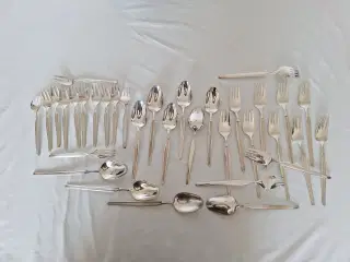 Spisebestik 17 dele 3 spiseskeer, 2 gafler, 3 knive, 2 kagegafler, 2 serveringsskeer, 1 sæt salat bestik, 1 kagepalet, 1 dessertske, og én marmeladeske Rustfrit Samlet pris: 60 kr. Næsten ny