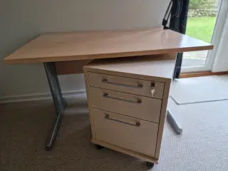 Flot hæve/sænke skrivebord til chefkontoret. Bordplade i egefiner og gavle i atrasit farve. Med kabelbakke og gennemføring til bord