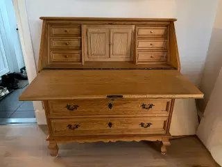 Flot ældre chatol i egetræ Blyindfattede glas i lågerne Lågerne kan låses 3 store skuffer forneden 6 mindre skuffer foroven Skriveplade kan låses Højde: 2,10 m Bredde: 1,00 m Dybde: 45 cm Fra røgfrit hjem uden hund Billig pris pga flyttesalg