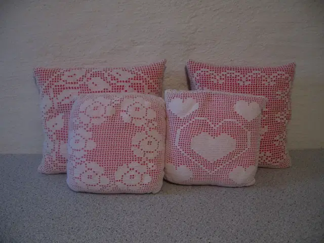 Hæklede pudebetræk.. 1 stk. str. 40x35cm, 1 stk. str. 35x35cm, 2 stk. str. 30x30cm. De 2 store koster kr. 45.- pr. stk. og de 2 små koster kr. 30,- pr. stk.
