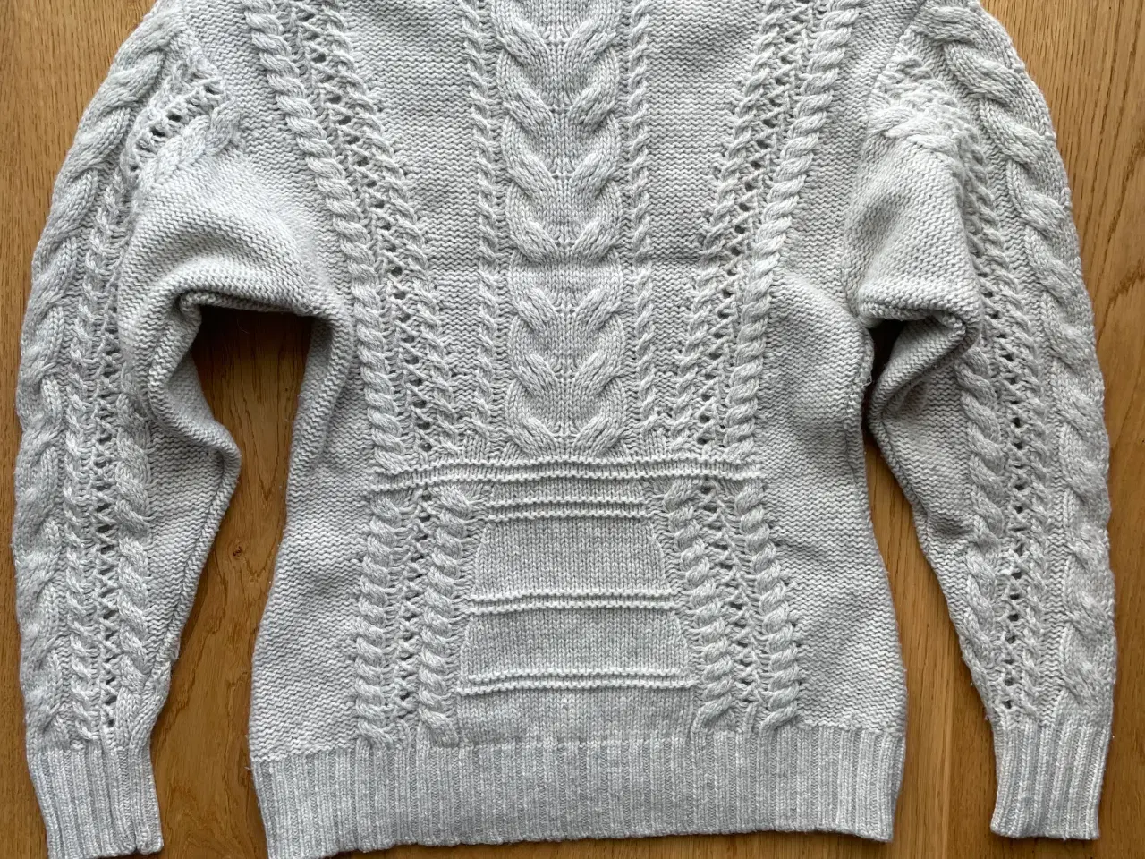 Designers Remix striktrøje i en meleret sand/lysegrå farve. Kabeldetaljer og hulmønster. Skal håndvaskes. Står hverken størrelse eller materiale i, men passer en størrelse S og tror det er uld. I meget god stand (har bare noget fnuller, der kan fjernes).