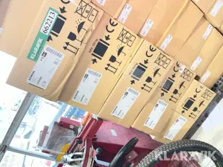 Stålreoler - 11 styk Mål og vægt Vægt: 40 kg Længde: 100 cm Højde: 152 / 200 cm Dybde: 50 cm Øvrige mål: Mål er pr. reol Læssehjælp: Læssehjælp efter aftale med sælgeren Udstyret med: - Træplader