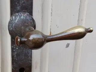 Antikke dørgreb og skilte komplet samt gammel lås. God og gangbar stand. Skilte afrenset for maling. Tilsvarende sidder i bygning fra 1864, Ribe Kunstmuseum. Kan sendes, køber betaler.