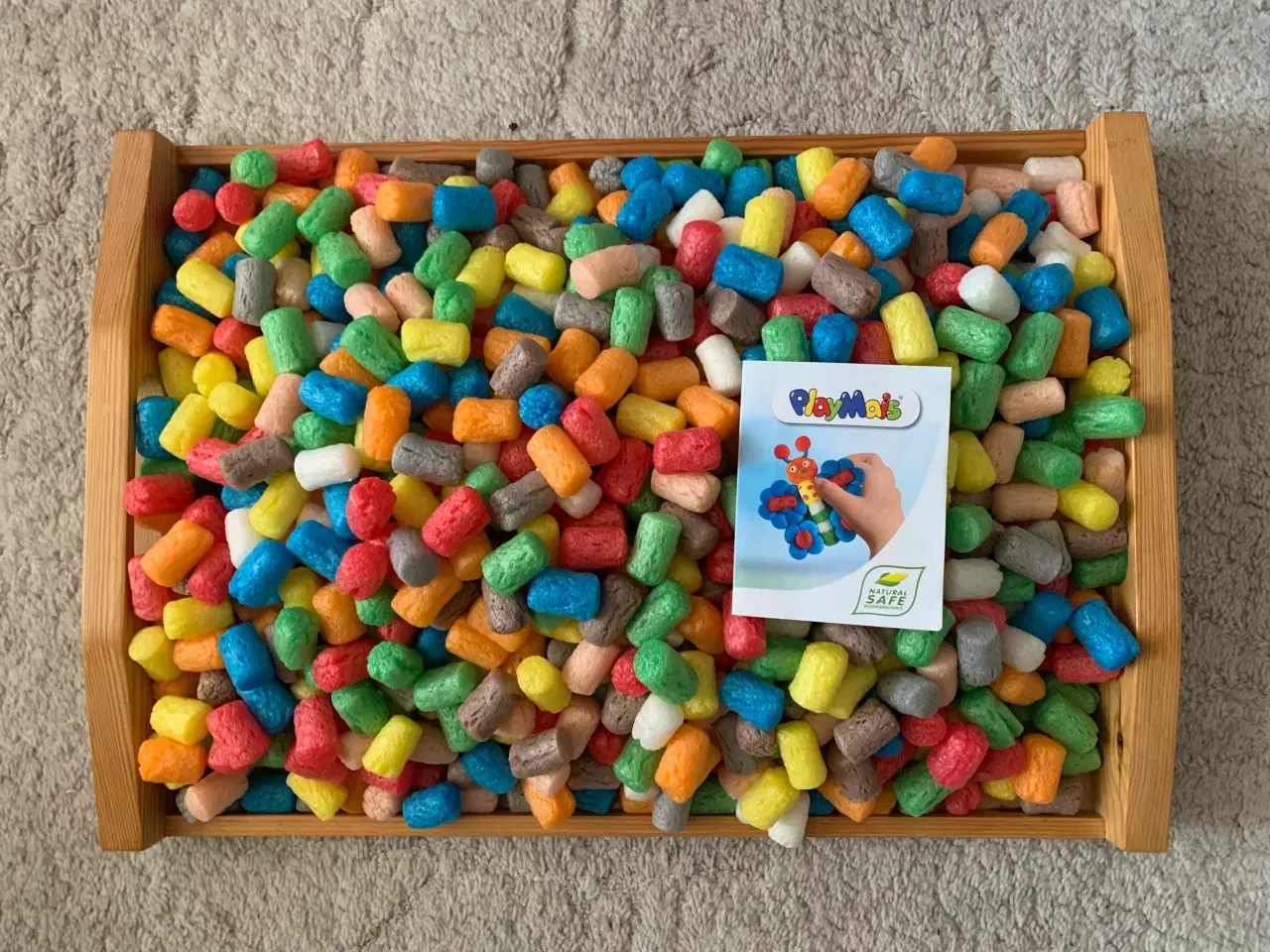Stor pose med Play mais til mange timers leg, de limes let sammen med vand de er lidt som flamingo så de er lette at forme og klippe i men de er lavet af majs så de kan også spises uden der sker noget.. Brugervejledning medfølger der er mange ideer og tips til hvad man kan lave.