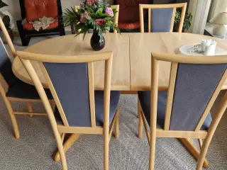 Spisebord med udtræk Ingen tillægsplader 8 højryggede stole i kunstværker. 1 stk med hul på bagbeklædning