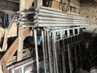 Komplet stillads Med alt. Fødder, violiner, ni Stk. Dæk, heraf fire med lem. Fodspark, tre Stk. Stiger, skaktrør, med mere. Kan udbygges to fag højere eller bredere, som vist på billedet. Meget let og fleksibelt. Sælges samlet og kan Evt. Lev. uden merpris. Ring eller skriv på Tlf.Nr 40571015