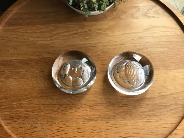 Halvkugleformet brevpresser med Skorpion Fra serien "Astro" med indpresset stjernetegn i bunden: "Skorpion" Design: Torben Jørgensen for Holmegaard Glasværk Højde: 5 cm og dia.: 9 cm - I klar glas. Pris: 50 kr.