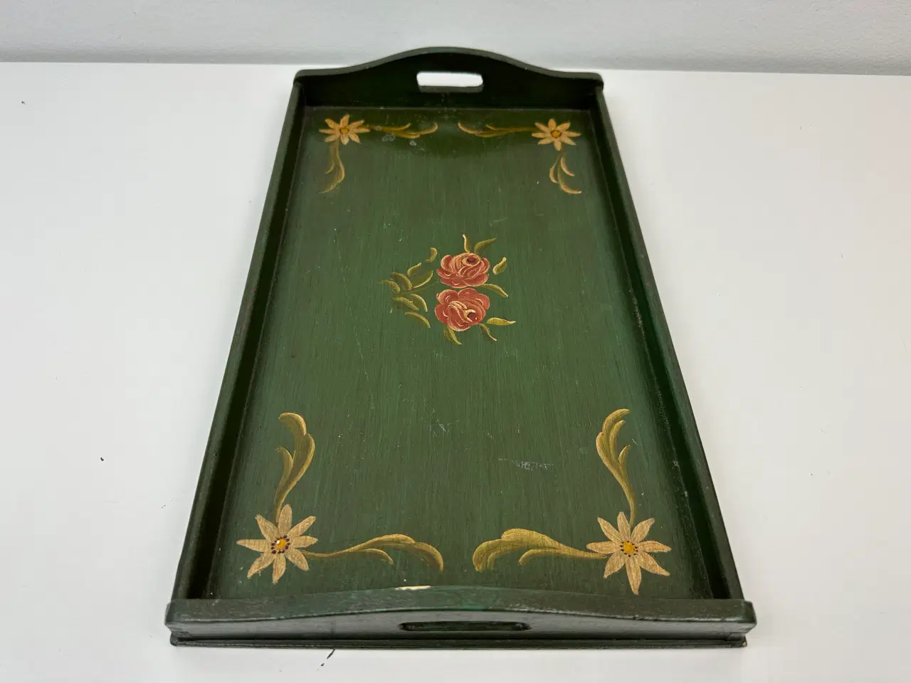 Der er her tale om en fin vintage serveringsbakke / bakke i træ med bemalet blomstermotiv. Måler: 37x22x4,5cm Kan bruges til fx en lille morgenmad/frokostbakke eller som opbevaring af andre små ting i indretningen. (se billederne) Ps: se også mine andre annoncer med ting til indretningen!