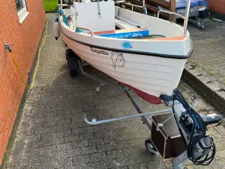 Sødygtig motorjolle med styrepult og åben opbevaring under siddepladserne. Den er desuden forsynet med kabine og aflåst opbevaringskasse. Båden har en Yamaha-motor (15HK) fra 2010.