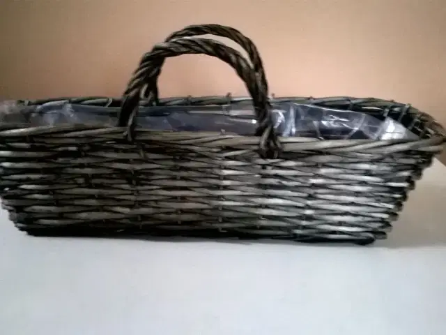 og plast indvendig til dekorationer i flot petrolfarve. Længde 48,5 cm og bredde 16,5 cm. Kurven fremstår som ny - se billeder. Sendes gerne, hvis køber betaler porto.