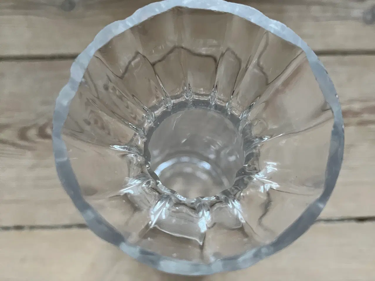 Klart Hyacintglas med optiske striber, nok Holmegaard. Det er 16,5 cm højt og 6,5 cm i dia Spi.stu