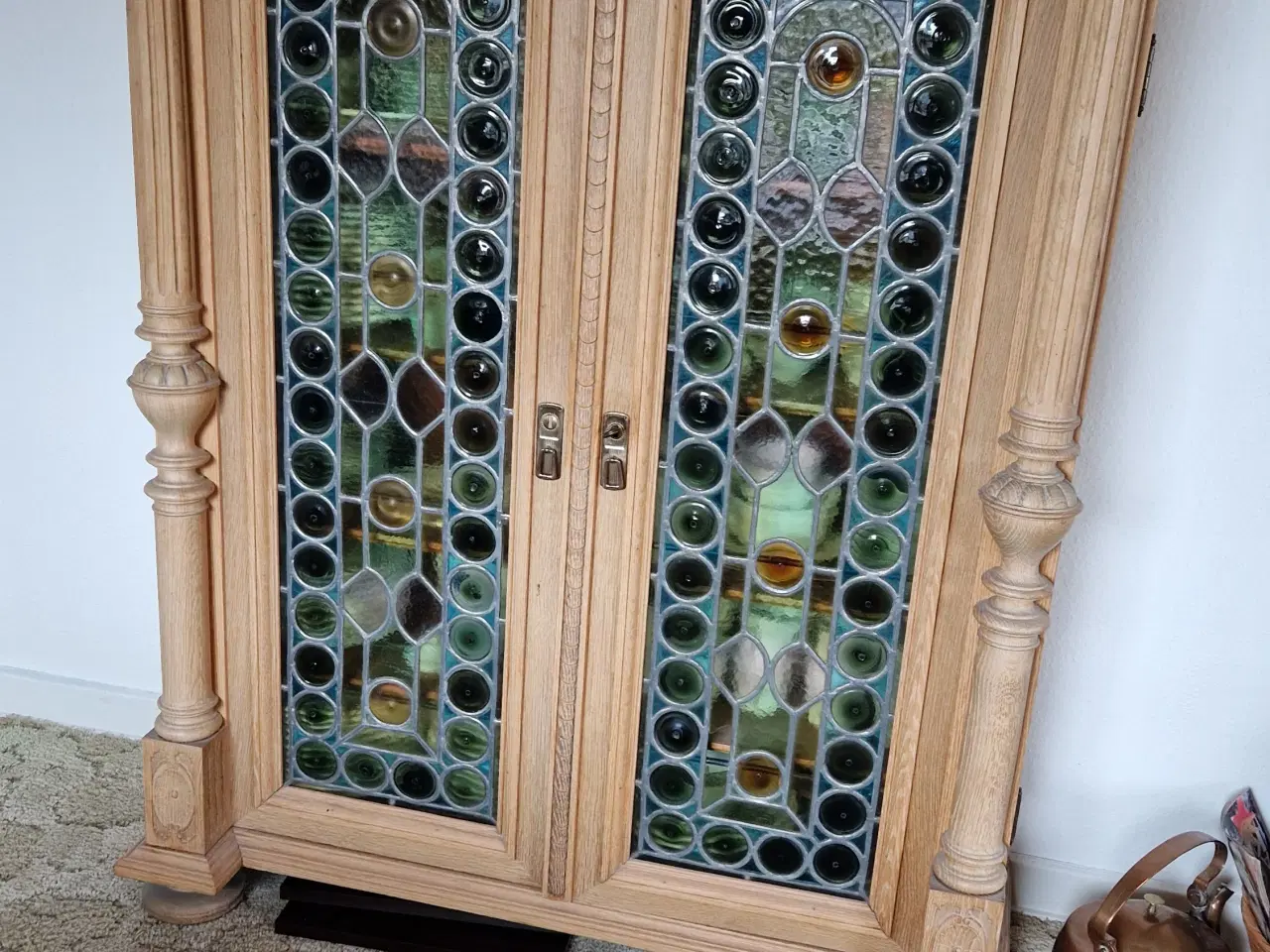 Vitrine skab, dækketøj skab, med mundblæst glas i bly indfatning. H. 160cm, B. 117cm, D 42cm Har også skænk I samme design.
