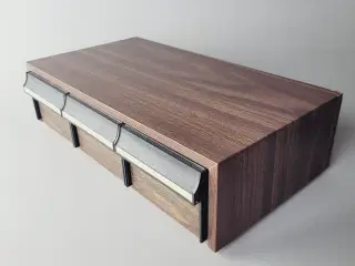 Vintage Kassetteboks / Opbevaring (Træ-look) - 30 Bånd Beskrivelse: Super flot retro kassettebåndholder/boks i klassisk 70'er/80'er design. Perfekt til at stå under et stereoanlæg! Design: Mørkt "træ-look" (laminat/finér) med sorte/beige fronte. Passer til mange vintage Hi-Fi-opsætninger. Kapacitet: Indeholder 3 skuffer med plads til i alt 30 kassettebånd (i etuier). Hver skuffe har plads til 10 bånd. Mål (ca.): Bredde: 38 cm Dybde: 21 cm Højde: 10 cm. Stand: God vintage stand. Som det fremgår af billederne er den brugt, men ellers i fin stand. ____________________________________________________ FRAGT: Denne vare KAN SENDES FÅ BILLIG FRAGT VED HURTIG HANDEL. Hvis du i din første besked skriver "JEG VIL KØBE" oplyser navn, adresse samt mail og telefonnummer (til forsendelsen), og få fragten til KUN 39 kr.