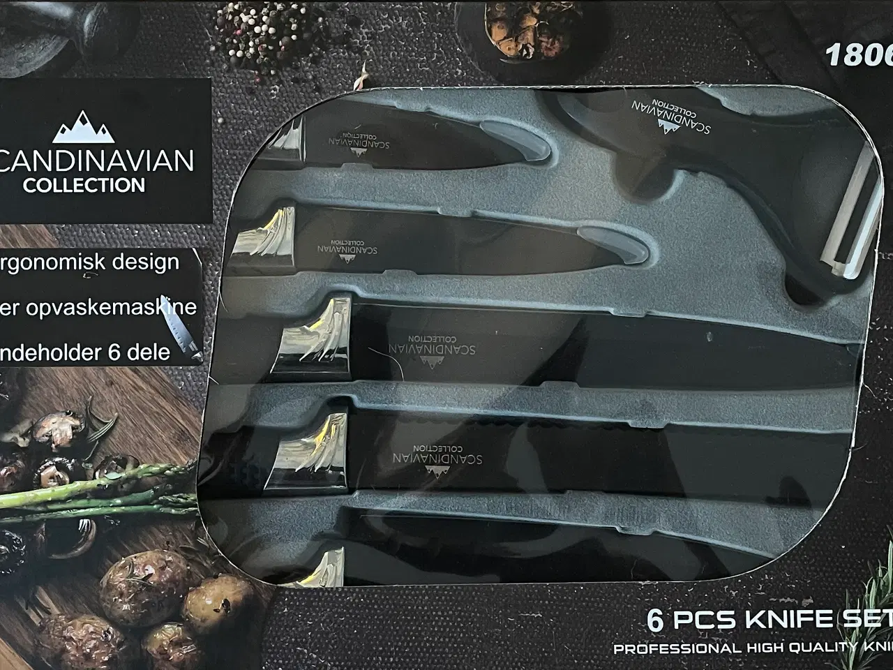 Knivsæt bestående af 6 dele Ergonomisk design Helt nyt, har aldrig været brugt Kommer fra røgfrit hjem
