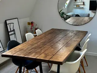 Voksbehandlet rustikt plankebord af 4,5 cm tykke massive planker. Benene er af træ og kan skrues af. Naturlig patina efter brug