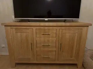Skænk med 4 låger og 4 skuffer. Der er en vandskjold som ses på billedet. Materiale lys eg.