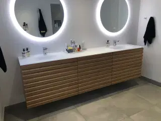 Absolut fedeste design lige nu! lameller i Eg - sort eller hvidtonet - du bestemmer! 3 x 600 mm korpus. Et stk. med 1 x 600 med udskæring i øverste skuffe. Vaskeplade i solid surface = corian. Lækker overflade som er nem at holde - samt pladen kan repareres. 1850x480x12mm Sidste billeder: Med firkantet/hjulspor vask og et hanehul. (billede viser 2 stk.)