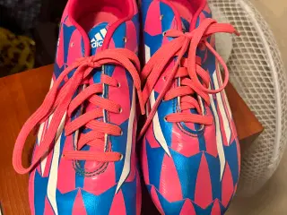 Adidas F5 fodboldstøvler i blå og orange farver. Støvlerne har gummisål med knopper, designet til spil på græsbaner. Materialet er syntetisk, og de er velegnede til brug af både børn og voksne. Størrelse 36. Fra ikke ryger hjem. Pris 85 kr.