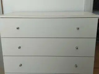 Beskrivelse: Sælger denne flotte og meget rummelige hvide kommode med 5 dybe skuffer. Den har et klassisk look med dobbelte greb, som passer perfekt ind i de fleste hjem. Bemærk: Der er lidt brugsspor/små ridser på toppladen (se billede), men intet der påvirker funktionen. Det kan nemt skjules med en dug, en lampe eller lidt hvid maling, hvis man ønsker det helt perfekt. Detaljer: Opbevaring: 5 store skuffer med masser af plads til tøj eller sengetøj. Greb: Elegante buede håndtag på alle skuffer. Stand: God og stabil, men med de nævnte overfladiske ridser på toppen.